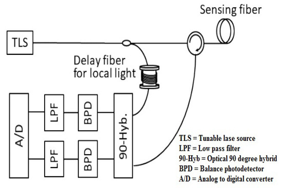 In Equations (4) and (5), and represent the delay generated by the local delay fiber and delay round trip, respectively. In addition, an optical 90-degree hybrid resolves the beat signals among and into in-phase and quadrature components [18,19,20], which are written as