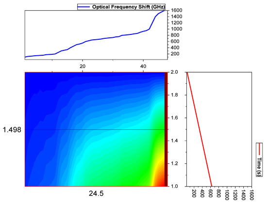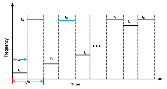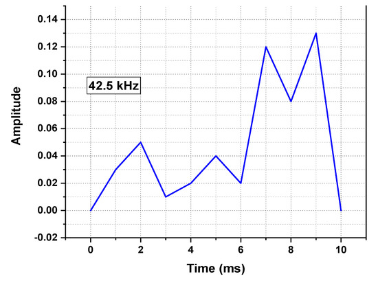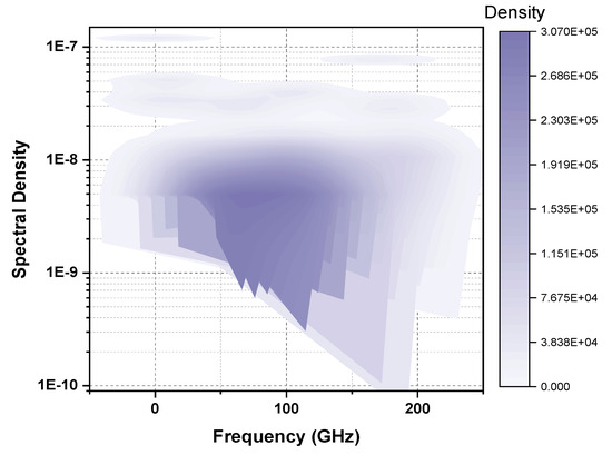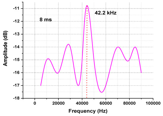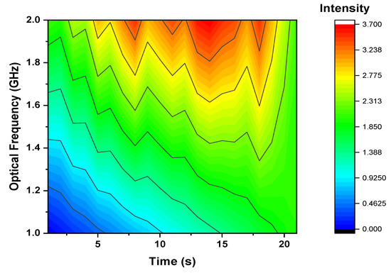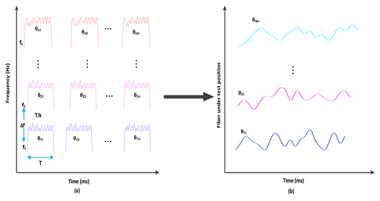 The configuration of OTDR-coherent FDM vibration sensing is declared in Figure 5 for long path estimations. The narrow band input light is divided into two parts using an optical coupler, where one part of the light is used for local light to detect heterodyne while the second division of light is used as a test light. To get the coherence length of light, the beat signal phase is kept constant, and the phase of the backscattered light is maintained. The single-sideband modulator is used for coding the test light with the help of frequency multiplexing. This procedure provides flexibility in experimental and vibration computations and shows a clear difference from the mechanisms discussed in [16,24,25,26]. As compared to the previous investigations, where electro-optical and acousto-optic modulators are used for frequency multiplexing and pulse inductions, respectively, this model produces the pulses by injecting a dummy frequency element among the multiplexed frequencies. Therefore, the essential procedures for vibration measurements can be achieved by a single modulator. The sequence of test pulse is mentioned in Figure 6, where several frequency parameters with w duration and frequency interval are organized in series with the same intervals. The dummy frequency is used to fill the pulse sequence, which has a different magnitude from the modulation frequencies to . To make the space among the frequency component of the pulse sequence, the pulses are continuously inserted into the FUT at intervals. The total duration T is kept greater than the round trip; to ensure that the same frequency element is not present in the vibration frequencies, the maximum number of multiplexed frequencies are required. By reason of the receiver bandwidth, the number of multiplexed frequencies are limited and can be measured as k/w. The beat signal current is realized by a photo-detector where the various frequency components are then divided into particular OTDR traces. The outcomes of the photo-detector are subjected to a short-time Fourier transform (STFT) to determine the complex phase of every frequency element. In the result of this applied procedure, the OTDR traces are achieved, which are described in Figure 7. The applied signal processing to OTDR tracer and the permutated OTDR tracer are depicted in Figure 7. The amplitude vibration trace is presented at different instants in time in Figure 8. For this reason, the 42.5 kHz frequency was selected, which declared that the maximum variations occurred among 8 and 9 ms. Figure 9 shows the analysis of amplitude vibrations in dB at various frequencies in Hz and 8 ms time. Here, the maximum change in amplitude is recorded at 42.2 kHz. The spectral density estimations for optical frequency are depicted in Figure 10, and this figure clarifies that high fluctuations in frequency enhance the spectral density. The experimental analysis of the proposed framework on the implemented optical fiber is shown in Figure 11 using time and distance for the evaluation of the optical frequency phase shift. The optical spectral structure is measured, which shows that the optical frequency shift is performed accurately even with a slight change in polarization because of external pressure. The measurement results are analyzed for both aerial and underground optical fiber cables implemented for communication.