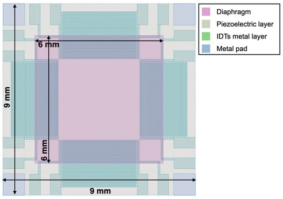 The top view of the proposed piezoelectric MEMS device, taken from the graphic design system (GDS) file, is reported in Figure 1. The proposed 9 × 9 mm MEMS device exploits a 6 × 6 mm highly doped silicon diaphragm with an aluminum nitride (AlN) piezoelectric layer deposited on top that can be actuated by eight interdigital transducers (IDTs), each composed by two interlocking metal comb-shaped arrays of twenty equally spaced fingers. The IDTs are placed on the inner and outer edges of the diaphragm and disposed symmetrically with respect to its centre. The doped silicon layer can be electrically connected employing the four metal pads located at the die corners. The layout of the device, and specifically of the IDTs, has been designed to create a general-purpose piezoelectric MEMS platform exploitable in different applications. In particular, the IDTs have been exploited to generate Lamb waves in the diaphragm at frequencies in the megahertz range to drive mechanical vortexes in liquids for biological applications [36].