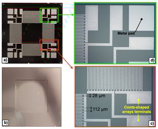 A front side polyamide protection coat, shown in Figure 2d in orange colour, is then applied to the top surface of the wafer. The wafer is then reversed, and the substrate layer is lithographically patterned from the bottom side, as reported in Figure 2e. Reactive ion etching (RIE) is used to remove the bottom side oxide layer while a DeepRIE (DRIE) is subsequently used to etch the substrate layer up to the silicon layer. Finally, the front side protection material is stripped during the release step, as reported in Figure 2f. Top and bottom views of the fabricated piezoelectric MEMS device are reported in Figure 3a,b, respectively. The proposed device embeds electrical terminals for each comb-shaped arrays of fingers, while four electrically shorted metal pads are placed in each corner of the device to contact the highly doped silicon layer beneath the AlN piezoelectric layer, as reported in Figure 3c,d, respectively. Each comb-shaped array of the IDTs includes fingers with width of 28 μm and pitch of 112 μm, as reported in Figure 3c.