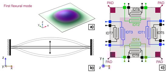 Two IDTs, namely IDT1 and IDT3, placed on the opposite inner edges of the diaphragm, shown in the simplified schematic of Figure 4c in blue colour, have been shorted and employed as a top plate over the piezoelectric layer.