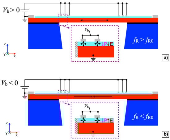 Cross-sectional view of the piezoelectric MEMS device with positive (Vb > 0 V) (a) and negative (Vb < 0 V) (b) bias voltage.