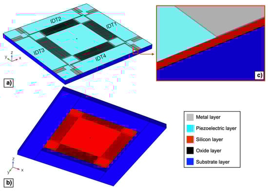 Top (a) and bottom (b) 3D model views of the proposed piezoelectric MEMS device. Enlarged image of the layers employed in the simulation model (c).