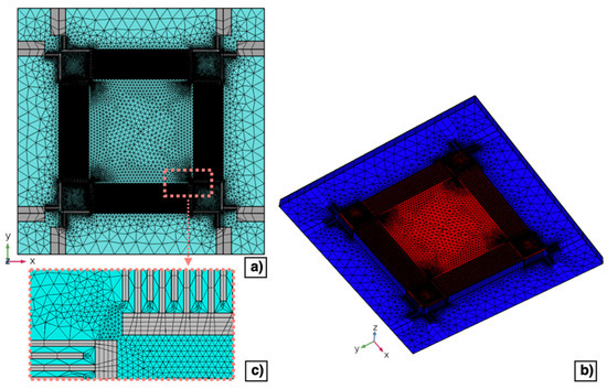 Top (a) and bottom (b) view of the mesh domain developed for the 3D model of the piezoelectric MEMS transducer. Enlarged view of the mesh of the comb-shaped arrays (c).
