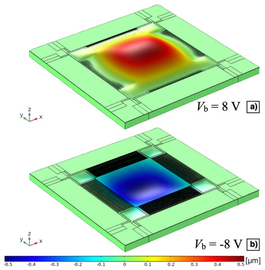 Z-axis displacement, not in true scale, of the MEMS device with Vb = 8 V (a) and Vb = −8 V (b).