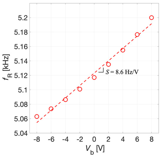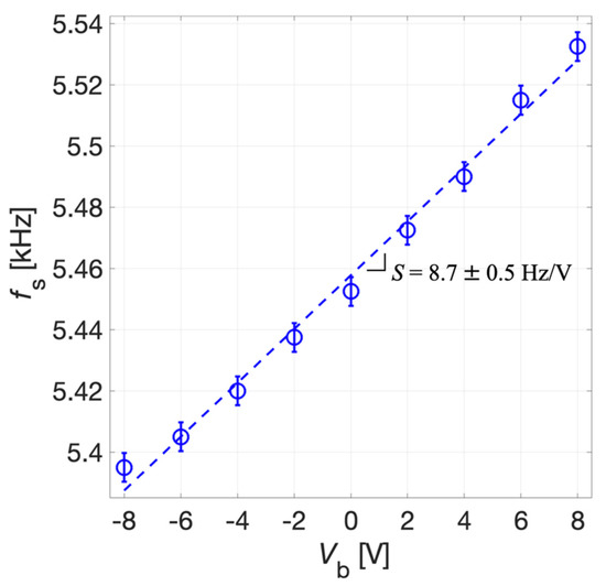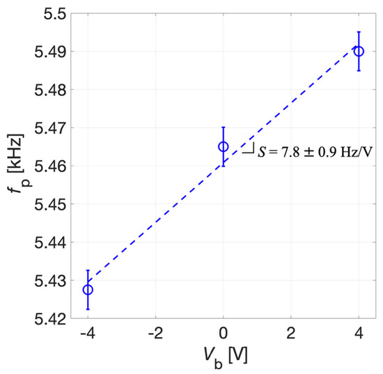The tuning sensitivity S of the system was derived by the linear fitting of experimental data reported in Figure 16. The uncertainty for fS, as for the receiver mode, was estimated as σ = 5 Hz. The tuning sensitivity S results 8.7 ± 0.5 Hz/V for the transmitter mode. The reported data demonstrates that a tunability of about 130 Hz can be obtained in the explored range for Vb. The obtained experimental values of S in the receiver and transmitter modes, taking into account their uncertainties, are compatible with each other in metrological sense [40] and closely approach the simulated value.