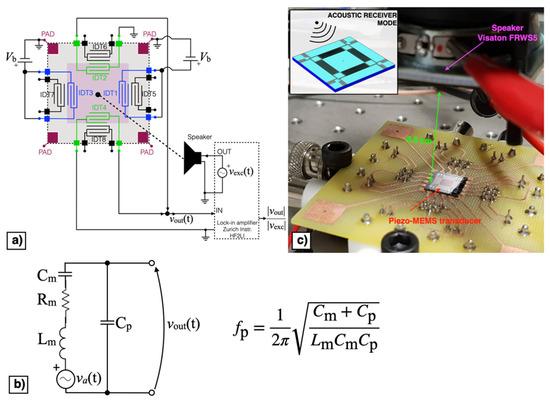 Block diagram (a), equivalent Butterworth–Van Dyke (BVD) model (b) and experimental set-up (c) of the piezoelectric MEMS device in acoustic receiver mode.
