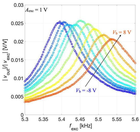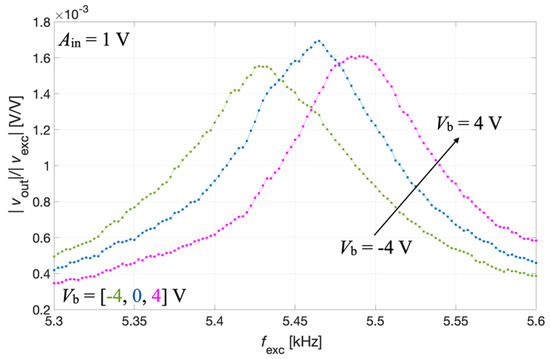 The output voltage signal vout(t) was measured across the parallel connection of IDT2 and IDT4, while the bias voltage Vb was applied between IDT1 shorted with IDT3 and the silicon pad using a power supply (Polytec: Grenoble, France). The acquired voltage vout(t) was synchronously demodulated with the excitation signal vexc(t) by the lock-in amplifier, thus providing the magnitude ratio |vout|/|vexc| of the resulting receiving transfer function which is plotted as a function of fexc for different values of Vb in Figure 12.