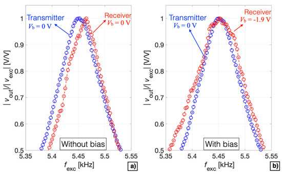 The measured tuning sensitivities and frequency shifts obtained in both receiver and transmitter modes demonstrate that matching of the series resonant frequency with the parallel resonant frequency can be obtained by acting on the bias voltage in either one of the two working modes. A comparison between the receiver and the transmitter modes in terms of the normalized measured magnitude ratio as a function of the frequency fexc without and with the applied tuning by Vb is reported in Figure 17a,b, respectively.