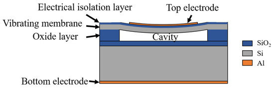 Each element in the CMUT is composed of multiple cells arranged in a 1D or 2D structure. Each cell is a parallel capacitor plate structure composed of electrodes, diaphragms, and cavities. The metal aluminum electrode and the silicon oxide layer are sequentially fixed on the surface of the diaphragm, and the silicon oxide acts as an electrical isolation. The vibration film is formed by the device layer of the silicon-on-insulator (SOI) wafer. The dielectric layer of the capacitance structure is formed by the vacuum cavity etched by the silicon oxide layer. The bottom part is composed of the silicon substrate layer and the metal aluminum electrode attached to the bottom surface. A schematic illustration of the CMUT cell structure is shown in Figure 1. When the CMUT is working, a DC bias voltage is often applied to make the film sink into the cavity; this way, the film stress increases the sensitivity of the transducer. When transmitting ultrasound, the AC signal should be superimposed on the applied DC bias voltage, and the driving frequency of the AC signal is the transmission frequency of ultrasound. When receiving, the conversion of mechanical energy into electrical signals is performed through the diaphragm. Thus far, the transducer structures of CMUTs applied in medical diagnosis, underwater detection, and industrial nondestructive testing are basically the same [24].
