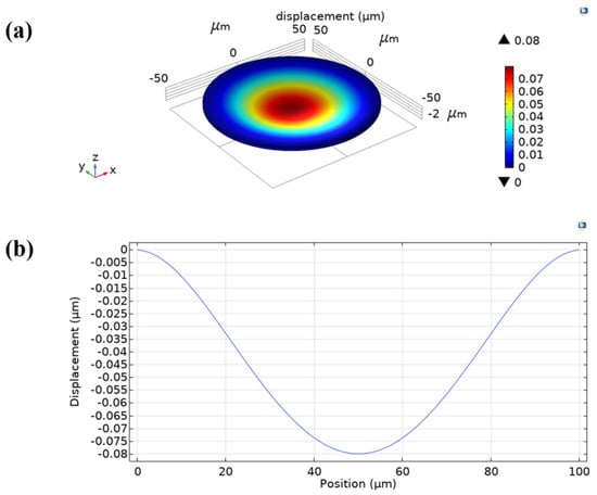 Membrane displacement under the applied atmospheric pressure. (a) 3D membrane displacement contour. (b) Displacement vs. position graph.
