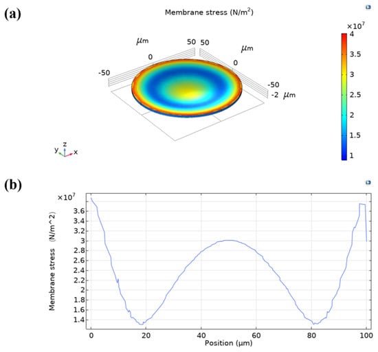 Membrane stress under the applied atmospheric pressure. (a) 3D stress contour. (b) Stress vs. position graph.