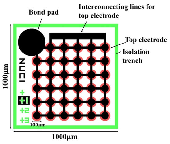 After the design and analysis steps, the photolithography mask was designed in L-Edit. Subsequently, a three-layer mask was prepared, which also reflected the simplicity of the preparation steps. The CMUT preparation process requires only three masks, and the main difficulty is the silicon wafer bonding process. The overlay effect of the mask is exhibited in Figure 4. In the preliminary preparation phase, two wafers are needed; the silicon wafer on the low resistivity silicon substrate, and the SOI wafer with a device layer thickness of 2 μm, which was prepared according to the process described in detail in the flow diagram in Figure 5.