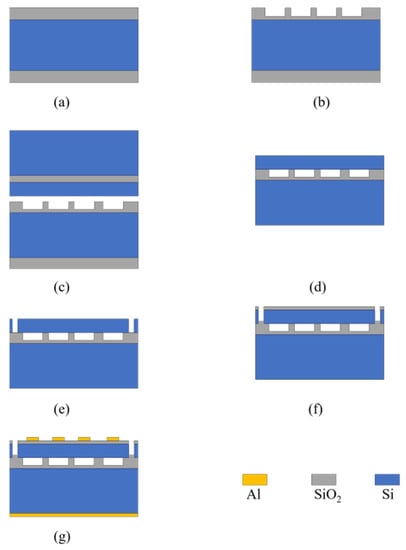 Process flow diagram: (a) Oxide wafer and SOI wafer preparation; (b) Etching of the cavity on the oxide layer of the oxide sheet; (c) Silicon wafer bonding of oxide wafers and SOI wafers; (d) Substrate layer and Buried Oxide Layer thinning; (e) Etching of the isolation slot on the membrane; (f) Silicon oxide deposition as an electrical isolation layer; (g) The metal is deposited and patterned as the upper electrode, and the entire lower surface is sputtered as the lower electrode.