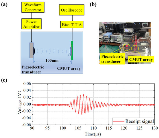 CMUT emission test. (a) Schematic diagram of the CMUT array emission experiment; (b) Photo of the experimental configuration; (c) Display of the received signal on the oscilloscope.