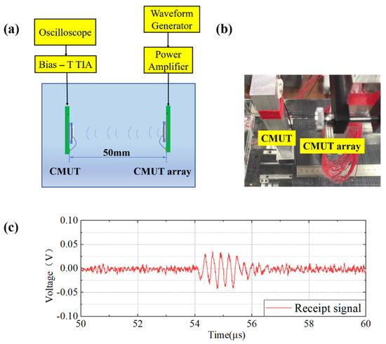 In this paper, the receiving sensitivity of the CMUT was tested following a comparison method; a schematic and the actual experimental device are presented Figure 10. A CMUT was selected as the transmitting source to transmit ultrasonic waves. The needle hydrophone with known sensitivity received the ultrasonic wave emitted by the transmitting transducer, and the oscilloscope recorded the amplitude of the received signal. Subsequently, the needle hydrophone was replaced by the CMUT array to be tested, and their positions were consistent. The oscilloscope recorded the voltage signal received by a single element of the CMUT array. The ratio of sensitivity was defined as the ratio of signals received in the two experiments. During this process, the transmitting transducer and the signal receiving device were always maintained on the same axis.