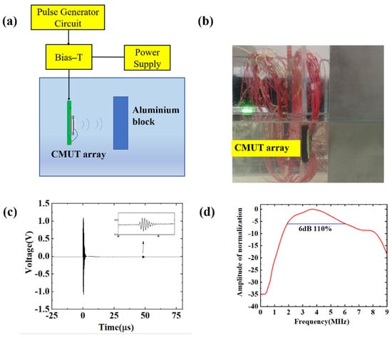 CMUT bandwidth experiment. (a) Schematic diagram of bandwidth test principle; (b) Photo of the experimental configuration; (c) The pulse echo receives the signal; (d) Normalized bandwidth curve.