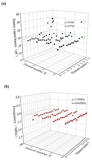 CMUT consistency test results. (a) Static capacitance distribution and mean variance of the 64 array elements; (b) Resonant frequency distribution and variance of the 64 array elements.