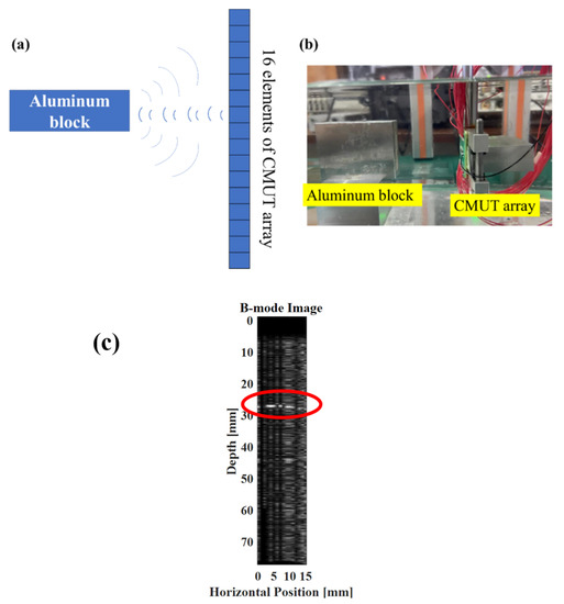 CMUT emission array imaging experiment. (a) Schematic diagram of CMUT single line array imaging; (b) Photo of the experimental configuration; (c) Imaging result: the red circle indicates the first reflective surface of the aluminum block.