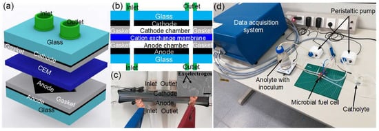 The anode and cathode are both fabricated by depositing thin-film Ti/Pt (10 nm/100 nm) by e-beam evaporation (Denton Explorer, Denton Vacuum Inc., Moorestown, NJ, USA) onto two precleaned glasses slides with dimensions of 76 × 25 × 2 mm3 (Sail Brand, Hongda Medical Instrument Ltd., Yancheng, China). Two silicone gaskets (2000 µm thick, OUPLI Ltd., Taizhou, China) are patterned with a square opening of 1 cm2 to define the anode and cathode area to be 1 cm2. The volumes of the anode and cathode microfluidic chambers are 200 μL, which require less sample consumption for water toxicity monitoring compared with macroscale or mesoscale MFC biosensors. Two nanoports (N-1032, Yijia Ltd., Beijing, China) are glued onto the other side of the glass slides without Ti/Pt by epoxy glue to provide microfluidic pathways into and out of the anode and cathode chamber. A cation exchange membrane (CEM) is cut to the dimension of 76 × 25 mm2 (CMI 7000, Membranes International Inc., Ringwood, USA.) and sandwiched between the two silicone gaskets to allow only cations to pass through. A schematic and cross-sectional view of the microscale MFC biosensor after assembly is shown in Figure 1a,b. The optical image of the microscale MFC biosensor is shown in Figure 1c and the optical image of the microscale MFC biosensor measurement setup is shown in Figure 1d.