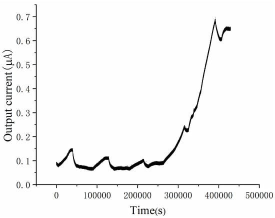 After the output current of the microscale MFC biosensor stabilizes, formaldehyde is spiked into the anolyte. An anolyte with a large range of formaldehyde concentrations (1 × 10−6 g/L, 5 × 10−6 g/L, 1 × 10−5 g/L, 3 × 10−5 g/L, 1 × 10−4 g/L, 3 × 10−4 g/L, 6 × 10−4 g/L, 1 × 10−3 g/L and 3 × 10−3 g/L) is injected into the anode chamber of the MFC biosensor at a flow rate of 250 µL/min by a peristaltic pump (Kamoer Ltd., Shanghai, China) to monitor the impact of the formaldehyde concentration in the anolyte on the output current of the microscale MFC biosensor. For each formaldehyde concentration, we wait until the output current of the MFC biosensor stabilizes before increasing the formaldehyde concentration. A resistor of 29.79 kΩ is connected between the anode and cathode of the microscale MFC biosensor, and the voltage across the resistor is recorded every 30 s by a data acquisition system (Bio-Logic VSP300, BioLogic Science Instruments, Seyssinet-Pariset, France).