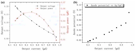 (a) Polarization curves of the microscale MFC biosensor, including the output voltage versus output current and output power versus output current curves; (b) Anode potential versus output current for the microscale MFC biosensor during polarization characterization.