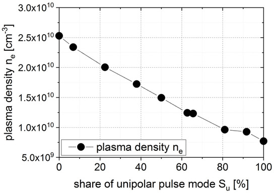 Plasma density in dependence of share of unipolar pulse mode in unipolar–bipolar hybrid pulse mode operation (example of Si process, adapted from [14]).
