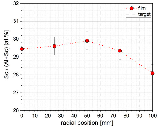 The first coatings were performed directly on Si substrates, and the film thickness distribution was ±1.5% at Ø180 mm and ±3% at Ø200 mm. The film composition was determined by EDS. The results are shown in Figure 2. The Sc content of the AlXSc1-XN films was slightly below that of the nominal target composition as given by the manufacturer, especially at a longer distance from the symmetry axis of the magnetron, going as low as 28 at.% Sc at the radial position 100 mm, while being around 29.5 at.% Sc in the inner coating area. These (minor) variations can be attributed to geometric effects such as shadowing of particle flux by the outer plasma shields and the difference in angular distribution of sputtered Al and Sc atoms. The latter effect is expected to be more pronounced at low target–substrate distances (TSD 90 mm) and low pressure, i.e., a high mean free path of atoms.