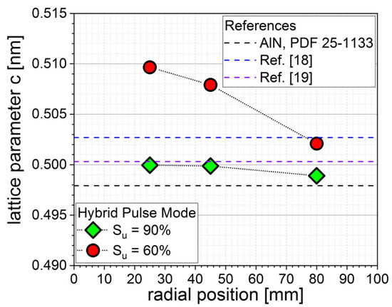 Calculated c-lattice parameter of 0.9 µm films deposited with different hybrid pulse modes depending on radial position (PDF 25-1133; theoretical AlN lattice parameter c = 0.49792 nm, as well as calculated values for Al0.7Sc0.3N from [18,19] for comparison).