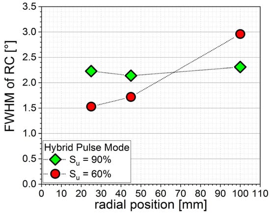 The rocking curves of (002) peaks shown in Figure 5 exhibited a similar behavior of radial dependencies. The films deposited at pulse mode Su = 90% had homogenous values of around 2.1–2.3° over the whole deposition range. In contrast to this, films deposited with a higher share of bipolar pulse mode showed a significant increase in FWHM from 1.5° in the middle, where energetic particle bombardment during film growth was highest, to 3° at the outer position, where energy bombardment was much lower. This is also in line with Figure 3, where the 2.5 µm-thick film deposited at pulse mode Su = 90% showed a homogenous occurrence of, although barely visible, (102) and (103) peaks, whereas the film deposited at pulse mode Su = 60% exhibited them only at the outermost position.