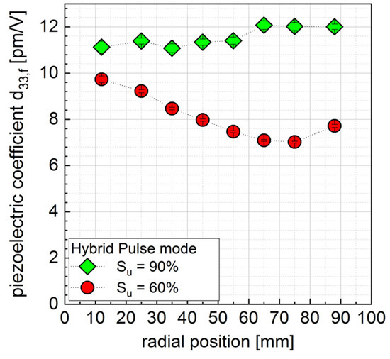 The material parameter d33,f of 0.9µm AlScN films is shown in Figure 6. Every data point refers to a least 20 single electrodes. These electrodes are within < ±5 mm distance to the noted radial position in the figure. As can be seen, the films deposited at a more unipolar pulse mode Su = 90% showed a homogeneous radial distribution of around 11–12 pm/V with only a slight increase towards the outer coating area. This conforms with the XRD data, which show homogenous rocking curve FWHM. On the other hand, the more bipolar pulse mode resulted in films, which showed a maximum of d33,f = 10 pm/V in the middle of the deposition area and a decreasing value until reaching 7 pm/V at radial position around ca. 70 mm from the center with a slight increase towards higher radial positions again. The maximum value of d33,f was lower compared to films grown at higher unipolar pulse mode. This is somewhat congruent with the XRD data, as it shows an increase in FWHM of (002) rocking curve towards the edge, although FWHM started at a lower value compared to films deposited with a more unipolar pulse mode.