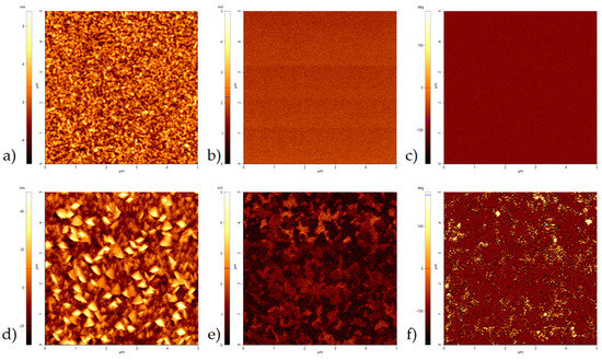 PFM results (area 5 µm × 5 µm) of 2.5 µm AlScN, deposited with Su = 60% pulse mode, at radial positions 25 mm (a–c) and 100 mm (d–f): topography (a,d), piezoelectric amplitude (b,e) and piezoelectric phase (c,f).