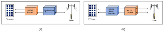 The structures of PV grid-connected power systems with (a) a low-frequency transformer; (b) a boost converter.