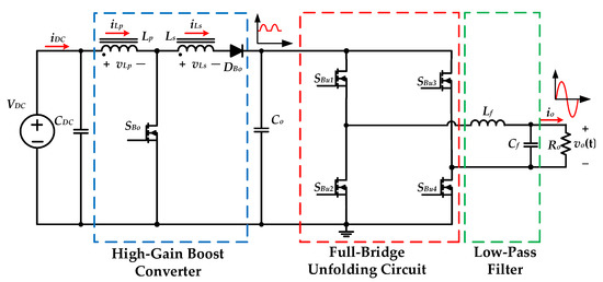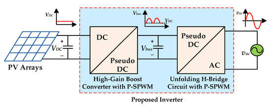 Based on the above considerations, this paper proposes a high-gain and high-efficiency inverter with magnetic coupling, the block diagram of which is shown in Figure 3. The proposed inverter combines a high-gain boost converter with coupling inductor and a full-bridge unfolding circuit. When the instantaneous output voltage is higher than the input voltage, the high-gain boost converter is controlled by sinusoidal pulse-width modulation (SPWM), and the full-bridge unfolding circuit is only used for switching the polarity of the output voltage. When the instantaneous output voltage is lower than the input voltage, the power switch of the high-gain boost converter remains in off state, and the full-bridge unfolding circuit is controlled by SPWM to step down the input voltage to the desired output voltage. This control method is called partial SPWM (P-SPWM), because the high-gain boost converter and the full-bridge unfolding circuit are sequentially and respectively controlled by high-frequency SPWM as the instantaneous output voltage varies. Generally, the following features of the proposed inverter are: