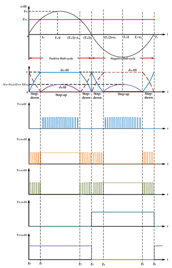 Figure 5 presents the timing diagram of the proposed high-gain inverter within one cycle of output voltage vo(t), where VM is the amplitude of vo(t), To is the period of vo(t), and dBo(t), dBu1(t), and dBu3(t) are the duty ratios of switches SBo, SBu1, and SBu3. Additionally, VGS,Bo(t), VGS,Bu1(t), VGS,Bu2(t), VGS,Bu3(t), and VGS,Bu4(t) are the conceptual gate-driving signals of all power switches.