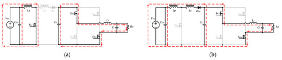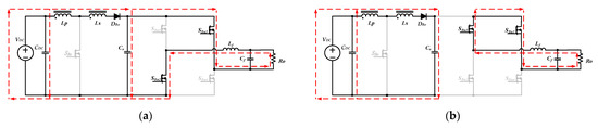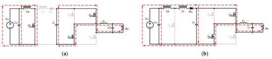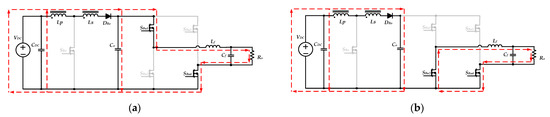 within one switching period, when Sbu1 is turned on, and SBu2 is turned off, the input voltage VDC simultaneously charges the inductor Lf and provides the energy required for the output load through the diode DBo. The equivalent circuit is shown in Figure 6a. When SBu1 is turned off, and SBu2 is turned on, the inductor Lf releases energy to the output load. The equivalent circuit is shown in Figure 6b.