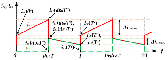 where dBo is the duty ratio of SBo. In Figure 8, iLP(0+) is the initial value of the primary inductor current, so the end value iLP(dBoT−) of the on state of the switch SBo can be expressed as