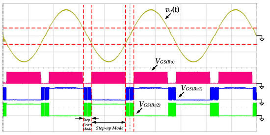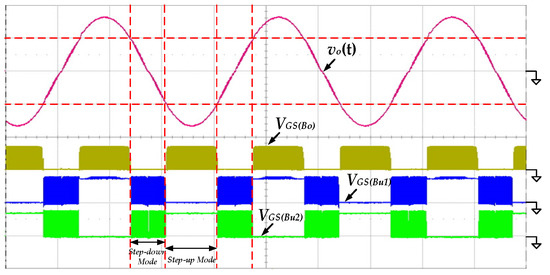 Figure 12 shows the measured waveforms of the gate-driving signals of the switches SBo, SBu1 and SBu2 under the condition of 100 V input voltage and 500 W output power. When the absolute output voltage |vo(t)| is lower than 100 V, the proposed inverter operates in step-down mode. The switches SBu1 and SBu2 switch with high frequency, and the switch SBo remains in the off state. Conversely, the proposed inverter operates in step-up mode. The switch SBo is switching with high frequency, and the switches SBu1 and SBu2 perform low-frequency switching only to switch the polarity of output voltage.