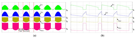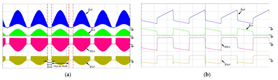 Figure 16 presents the measured waveforms of the currents and the voltages of the coupled inductor. As shown in Figure 16a, the coupled inductor is still used as a filter in step-down mode, and the inductor voltages are almost zero. The waveforms are zoomed-in at the peak of the output voltage vo(t) and shown in Figure 13b. Due to the higher input voltage, the duty ratio of the switch SBo is reduced, and the charging time of the primary inductor is shorter. During the switch SBo turning off, the inductor currents iLP and iLS are still the same, proving that the primary and secondary inductors are discharging in series to increase voltage gain.