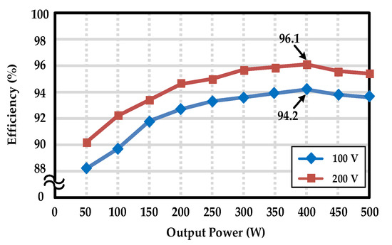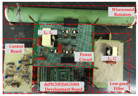 The total harmonic distortion (T.H.D.) and odd-order harmonics of the output voltage at full load are measured and listed in Table 4. All measured harmonics comply with the standard of EN6100-3-2 Class C. The efficiency curves of the proposed inverter are illustrated in Figure 17. As can be seen, the conversion efficiencies reach up to 96.1% at 200V input voltage and up to 94.2% at 100V input voltage, verifying that the proposed inverter can indeed achieve high efficiency. Additionally, Figure 18 shows a photograph of the prototype hardware used for the experimental measurements, in which the dsPIC33FJ16GS504 development board is used to generate the P-SPWM driving signals, and a wire-wound resistor is used as a testing load.
