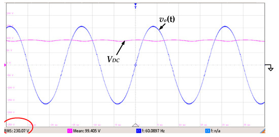 The experimental waveforms of the output voltage vo(t) and input voltage VDC at 230 Vrms output and 100 V input (vo(t): 100 V/div; VDC: 50 V/div; time: 5 ms/div).