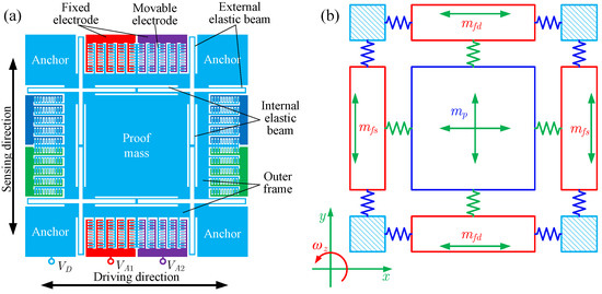Figure 1a is a schematic diagram of the symmetrical gyroscope [16]. The proof mass is connected to the outer frame by internal elastic beams and then supported on the anchor by external elastic beams. Figure 1b shows the corresponding spring-mass model. The blue and green springs represent the external and internal elastic beams. x and y are the driving and sensing directions, and z is the direction of the vertical paper facing outward. is the proof mass, and are the masses of the driving and sensing outer frames, and . The proof mass can move in two directions, while the driving and sensing outer frame can move in only one direction. During the gyroscope operation, the DC voltage is applied to the movable structure, and the AC voltages and are applied to the fixed combs in the driving direction. The electrostatic forces drive the proof mass and the driving outer frame to vibrate in the driving direction. When the carrier of the gyroscope has an angular velocity around the z direction, the proof mass vibrates in the sensing direction due to the Coriolis effect. Then the vibration is transmitted to the sensing outer frame. The angular velocity can be determined by measuring the vibration in the sensing direction.