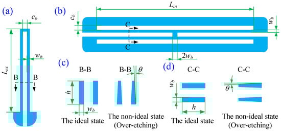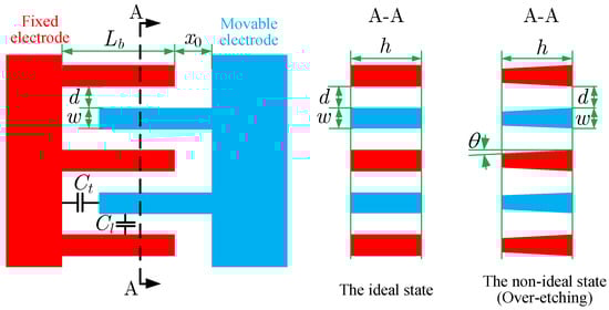As shown in Figure 3, two kinds of capacitances exist between the combs, the longitudinal capacitance and the transverse capacitance . For the non-ideal state, the working faces of the combs are not parallel, which consequently changes the capacitances. Assuming the inclination angle is small, the longitudinal capacitance considering the edge effect and the inclination angle is [12]
