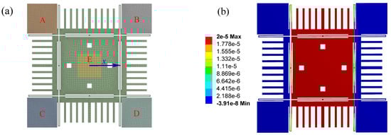 The finite element analysis of the restoring force (the displacement in the driving direction), where the displacement of the proof mass is , , and . (a) The FEA model, (b) The displacement contour.