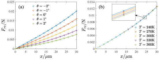 By changing the inclination angle from to in steps of , the environmental temperature from 240 K to 360 K with a step size of 10 K, and the displacement of the x direction from to with steps of , we can calculate the restoring force with different parameters. Figure 6 shows the relation between the restoring force and the displacement corresponding to different inclination angles and the environmental temperature, indicating that the variation is nonlinear. For convenience, we fit the restoring force cubically as