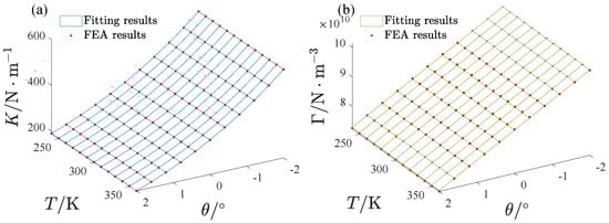 The fitting results are also shown in Figure 6. Figure 7 gives the influence of the inclination angle and the environmental temperature on K and . We also fit them as polynomials about and T.