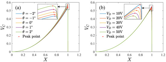 We investigated the effect of the DC voltage and the inclination angle on the pull-in boundary amplitude, as shown in Figure 9. It was found that the pull-in amplitude decreases with the DC voltage but increases with the inclination angle, which means pull-in is more likely to occur at a large DC voltage or a small inclination angle. Physically, the electrostatic force in the driving direction that causes the system to pull in increases with the DC voltage and decreases with the inclination angle. However, reducing the inclination angle leads to a rapid increase in the stiffness and the restoring force, which increases the pull-in boundary amplitude. Ignoring the inclination effect on the stiffness may bring about an opposite result. Therefore, it is necessary to consider the inclination effect on both the electrostatic forces and the stiffness.