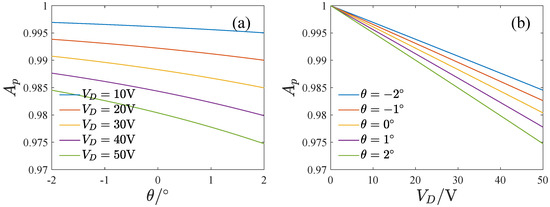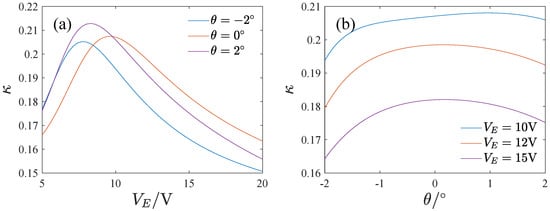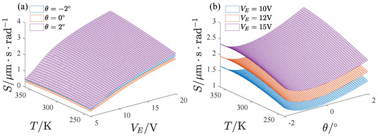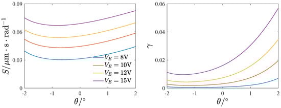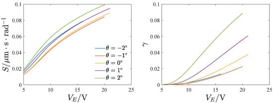 where denotes the mechanical sensitivity of the full temperature range of the gyroscope and is the mechanical sensitivity at . Figure 24 gives the effect of the inclination angle and voltage on the full temperature stability of the mechanical sensitivity. increases at first and then decreases with the voltage and the inclination angle. The mechanical sensitivity changes are smaller in the whole temperature range when the voltage is large or the inclination angle is negative.