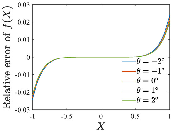 Figure 10 gives the relative error of the Taylor expansion of . The maximum error is less than . Substituting Equation (23) into Equation (19) leads to