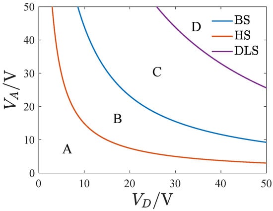 The transition sets on the DC-AC voltage plane with , where BS denotes the bifurcation set, HS denotes the hysteresis set, and DLS is the double limit point set.